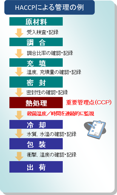 HACCPとは、食品等事業者自らが食中毒菌汚染や異物混入等の危害要因(ハザード)を把握した上で、原材料の入荷から製品の出荷に至る全工程の中で、それらの危害要因を除去又は低減させるために特に重要な工程を管理し、製品の安全性を確保しようとする衛生管理の手法です。